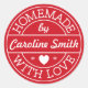 Red Valentine's day or Christmas Holiday cookie swap stickers featuring the text "Homemade" and "with love" designed as a white stamp and a white heart. Personalised name.