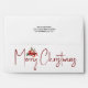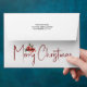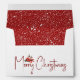Christmas ornament red Merry Christmas typogrpahy holiday envelope. It features the "Merry Christmas" typogrpaphy and a red Christmas ball ornament with a red bow and branches on the back. The inisde features a pattern with white snowflakes on red.
