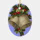 This oval Christmas ornament features bells on the front with a background of violet blue, with Luke, chapter 2, verse 14 on the back. "Glory to God in the highest, and on earth peace, good will towards men.