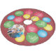 This Christmas tree skirt features a collage of multicolored round Christmas tree ornaments. One large ornament, at the bottom, is a custom photo frame for your favourite family photo. Custom text on two other ornaments allow you to add family names. All of the green ornaments feature text that reads: A very Merry Christmas. The background of this skirt is a deep dark red and the ornament colours are: red, green, blue and yellow. The entire skirt is accented with small lime green swirls.