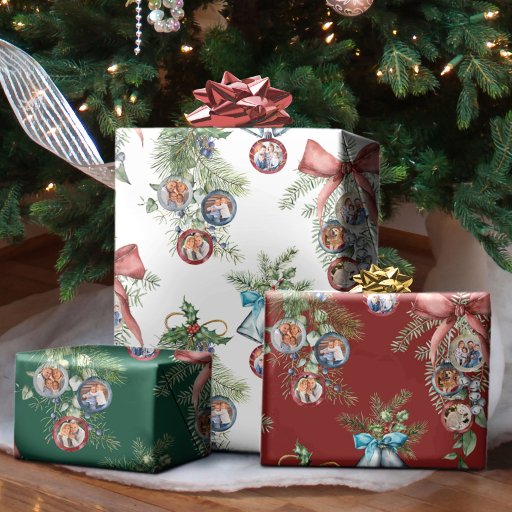This set of 3 wrapping paper sheets will be a hit with your gift recipients, when you add your own photos for one-of-a-kind gift wrap. Christmas ornaments hang from pine boughs decorated with holly, bells, and bows, and the ornaments each hold a photo. Each wrapping paper sheet has a different background colour. If you want all 3 to be the same, click on “Edit using the Design Tool,” and set the background colour the same for each sheet, or contact me through Zazzle Chat if you need help. Square photos work best.