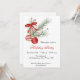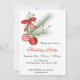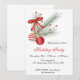 Holiday invitation with Christmas ornaments in white and red, tied with a bow and an evergreen sprig accent. Invitations come with envelopes and your choice of paper.