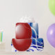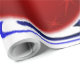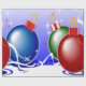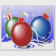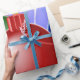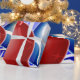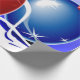 This image portrays Christmas balls in red, blue and green. Ribbons and stars in white, blue and red are seen throughout. A blue backround was added. This Christmas wrapping paper is available in assorted styles and sizes.