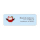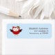 Adorable illustration of a cartoon brown owl wearing a red polka dot scarf, perched on a tree branch on a blue snowy background.