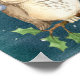 Two cute brown beige owls with orange eyes sitting on a brown tree branch with green leaves at night. The background is dark blue with white dots that looks like stars. The owls are looking at each other. The one on the left is wearing a pink beret with red dots on it. The owl on the right is wearing a red and white santa hat.