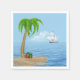 Holiday palm tree with lights, a gift, ornaments, and a boat on ocean water.