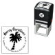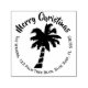 This fun tropical Christmas self inking return address rubber stamp has a silhouette of a coconut palm tree with string lights wrapped around the trunk. The words make a circle around the tree, a round shape.