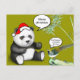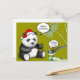 Christmas panda talking to a pheasant standing on a rock. with a green grass background.with Merry Christmas in black text. and season greeting from the Pheasants