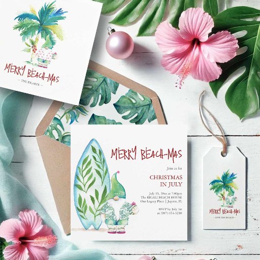 Set the scene for your Xmas party with these festive Christmas paper plates featuring a hand-painted tropical design! A jolly Santa stands beneath a charming palm tree on the beach, with the words "Merry Beach-mas" in playful hand-lettered typography.