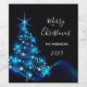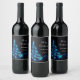 A trendy and modern Christmas dinner party wine label in black, blue and white. A black background with a shining glittery blue Christmas tree decorated wiht stars. With the text: Merry Christmas written with modern and trendy large white hand lettered style script. Templates for your family name and a year.