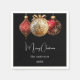 A black background, white text. Decorated with 3 red and faux gold baubles and gold stars. Text: Merry Christmas. Personalise and add your family name and year.