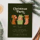 Whimsical and modern Christmas dinner party invitation card featuring hand drawn illustration of a cat and dogs in holiday theme. The background is green.