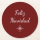 Christmas party Feliz Navidad red paper coaster, with a simple snowflake and script typography design. With customisable lettering, you can add your own text. A festive addition to your holiday celebration.