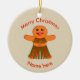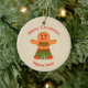 This ornament features a cute cartoon of a colourful gingerbread woman. She has black eyes with white pupils and pretty black eyelashes and a big smile on her face. She also has red and green tassels on her skirt and top ready for a Christmas party.
