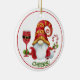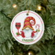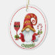 This fun Holiday ornament features a cute image of a gnome elf dressed in a red and gold reindeer pattern Santa hat. He holds a Santa Claus wine glass in one hand, and a red and white striped candy cane in the other. At the bottom is a custom text field, which is shown saying Cheers! in matching green. The back of the ornament has several text fields for your own message.