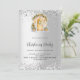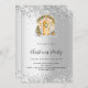 An elegant faux silver looking background and confetti. Decorated with a cosy entrance decorated with a Christmas tree and green pine decor. Christmas Party written with modern and trendy large hand lettered style script. Personalise and add your party information.