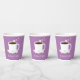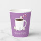 Holiday paper cups for a Christmas Hot Chocolate party. These cups feature a smiling mug of hot cocoa with a candy cane and several cheerful marshmallows on a lavender purple background. All of the words can be customised.