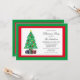 Christmas themed party invitation. Invite features red and green holiday theme with a Christmas tree and presents.