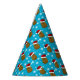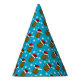 Make your Christmas party fun with these cute party hats featuring a funny repeat pattern of brown Christmas potatoes wearing red Santa hats with white trims and fluffy pompoms. Behind is a blue background with sparkly white snowflakes.