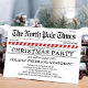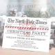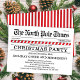This design features a Christmas party invitation, a funny festive, cute modern, traditional modern, unique, red and white candy cane stripes, with cute typography, and a whimsical, the north pole tomes, newspaper newsletter theme.