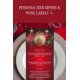 A red background, white text. Decorated with 3 red and faux gold baubles and gold stars. Text: Merry Christmas. Personalise and add your family name and year.