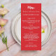 Christmas party dinner menu card. Personalise and add a name/event, date and the menu. A red background, white text.