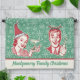 Throw a cool retro Christmas party with these super keen vintage-looking invitations! They have a mostly red / green colour scheme on a vintage cream background. The text says, "You're Invited to a Holly Jolly Jamboree!" The 1950s lady and gentleman are dressed in a Santa hat and reindeer antlers and are holding a martini drink glass and a champagne bottle. The design also includes a cartoon reindeer, snowman, gingerbread man, holly leaves, and candy canes, as well as icons of snowflakes, stars, an ornament and a gift box. The back has a snowflake pattern on red (you can also change the red "background" colour on the back to any shade in the design tool). You'll transport your guests back to a time when parties were swell with these mid-century modern holiday invites. Your party will be anything but squaresville! Use the easy templates to customise these humourous invites. "Customise further" if you need to adjust text size. The word "CHRISTMAS" is a design element, but it can also be moved separately or deleted in the design tool. Contact HaHaHolidays if you want to change "Holly Jolly Jamboree."