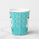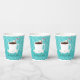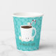 Holiday paper cups for a Christmas Hot Chocolate party. These cups feature a smiling mug of hot cocoa, with a candy cane and several cheerful marshmallows, on a snowflake and blue teal background. All of the words can be customised.