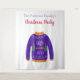 A tapestry for a fun holiday season and Christmas parties, dinners. A chic white background. Decorated with an ugly blue, white, orange and green xmas sweater. Personalise and add your family name, blue letters. The text: Christmas Party is written in red with a modern hand lettered style script. Can be used as a welcome sign, party wall decoration or as photo booth backdrop.
