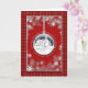 Christian Christmas Greeting with beautiful country church covered in snow and set within a Christmas Hanging ball ornament with red background and snowflakes. See same image scripture verse Luke 2:14 on front and another with same image wishing everyone a blessed Christmas