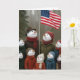 A cheerful family of snowmen, adorned in colorful scarves and hats, gathers around an American flag against a wintry backdrop.