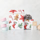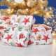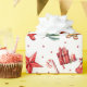 Bright, happy Christmas holiday wrapping paper featuring a seamless pattern of red stars, gingerbread men, fur leaves, stockings, presents and holiday candy, all on a white background.