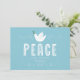 This non-photo holiday card features an illustration of a dove over the word peace on a light blue background. It has space for a greeting, your name, and the year.
