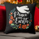 An elegant Christmas throw pillow with the words peace on earth in beautiful script lettering. A floral wreath surrounds the text with a pretty white dove. Desinged for you by Blackberry Boulevard.