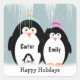 Cute penguin couple with baby and personalised names in snowflakes.