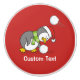 A little penguin cartoon wearing santa hat and green scarf bending to get a snow ball avoiding another one.