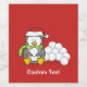 A little penguin cartoon with santa hat and green scarf sitting and holding a snowball.