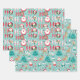 Cute matching Christmas set of wrapping paper featuring Santa, penguins, snowmen, polar bears, and gifts, on a pale green background.