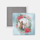 Christmas photo magnets with red green floral wreath with poinsettia, snowy background, your own photo and personalised text.