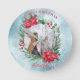 Christmas photo clock with red green floral wreath with poinsettia, snowy background, your own photo and personalised text.