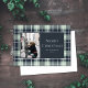 These Christmas holiday 7" x 5" flat greeting cards feature placeholders for your favourite photo, personal greeting, year and name, on a beautiful navy, mint and plaid background.