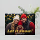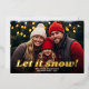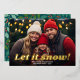 A modern look for a holiday photo card. A gold foil words - Let it snow! - is on top of the photo and holiday greeting.