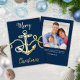 This gold and navy blue nautical Christmas card features real gold foil, with a photo template on the back along with an ocean-themed holiday message.