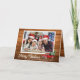 A beautiful rustic wood style "Merry Christmas" calligraphy script, your family photo, name with year or other text and a vintage red truck with Christmas trees. Personalise your message inside card for the perfect touch.