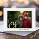 A modern look for a holiday photo card. A gold foil word - joy - is on top of the photo and holiday greeting.