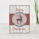 Pretty holiday greeting with round reindeer emblem and snowflakes along a rust red banner that runs width of card. Rustic white illustrated fence planks brighten up the background. A lovely way to wish your physical therapist a Merry Christmas.