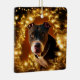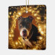 This festive ornament features a handsome pit bull surrounded by pine boughs and Christmas lights.