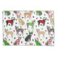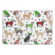 Cute Christmas Pitbull dogs with black, fawn, brindle, blue and red coat colours dressed in festive holiday outfits, Santa hats and argyle sweaters with scattered Christmas ornaments pattern.