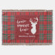 Cute home sweet home Christmas throw blanket you can easily customise by clicking the "Personalise" button, Featuring deer silhouette and clan MacTavish tartan in green and red chequered pattern
