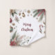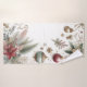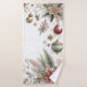 Add a touch of elegance to the decor of your bathroom with this three-piece towel set. This towel set features a red poinsettia flower, gold snowflakes, holiday greenery, and vintage green and bronze ornaments on a white background.